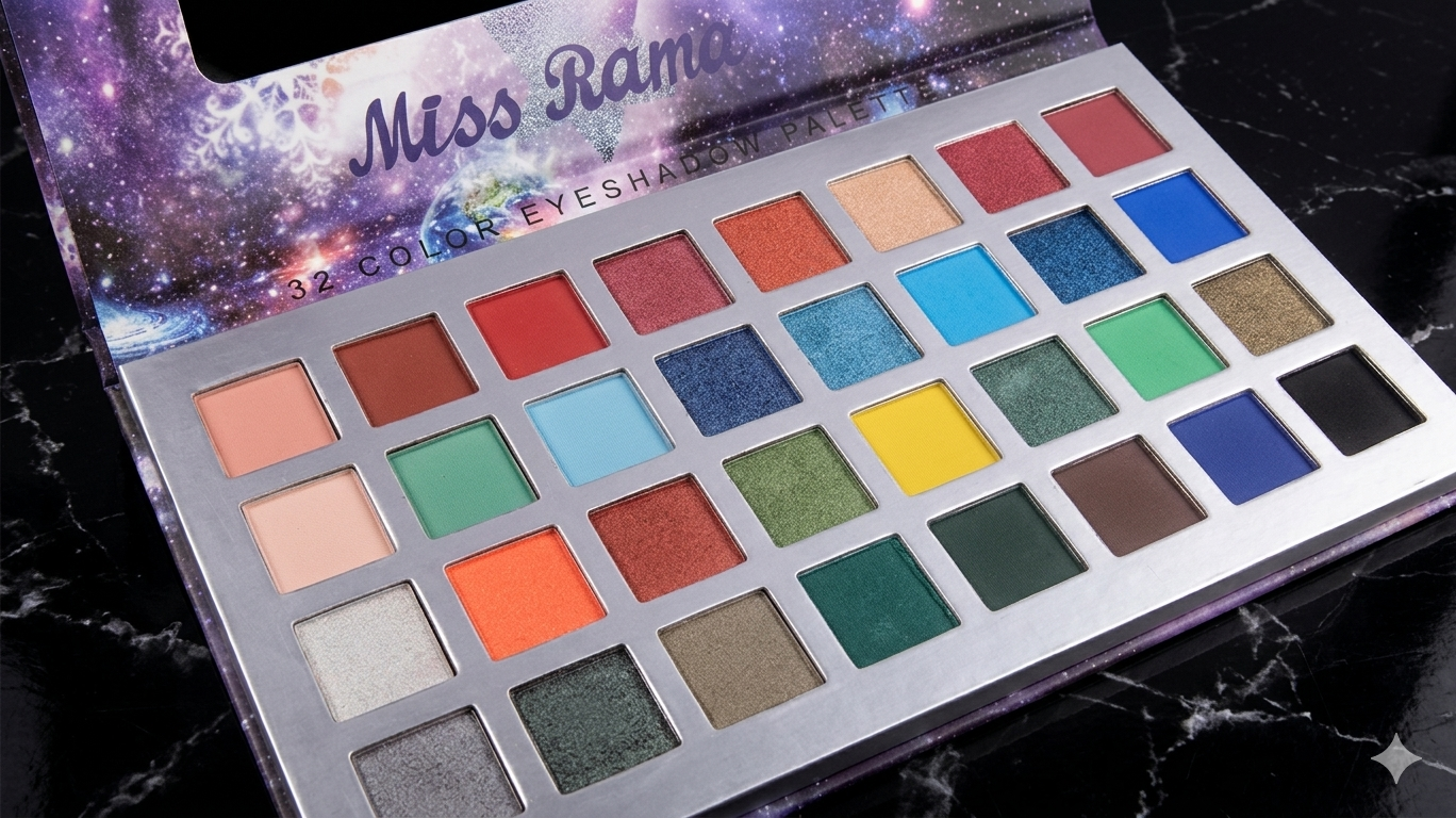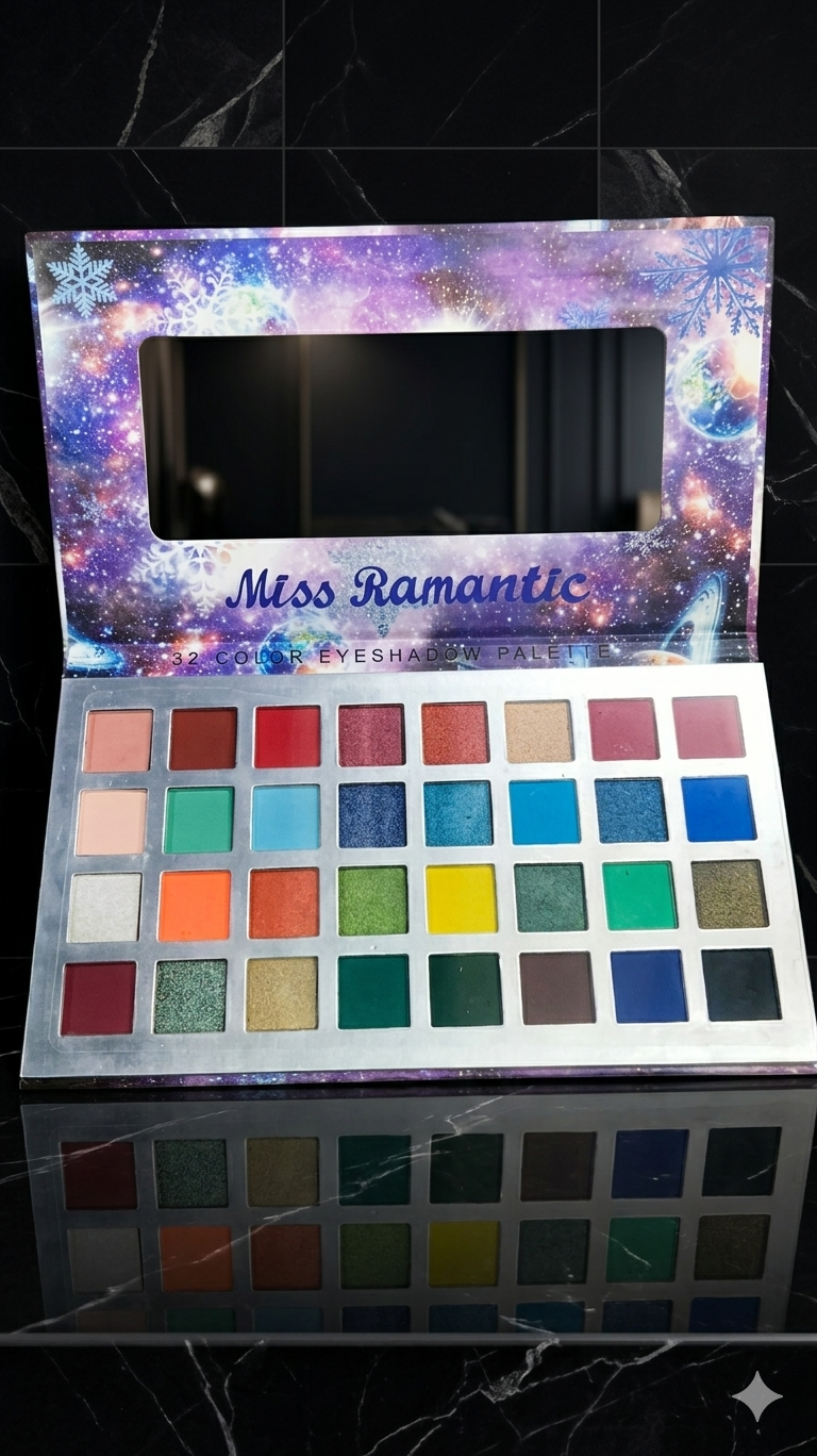 Unleash your creativity with the Miss Ramantic 32 Color Eyeshadow Palette, featuring a stunning mix of vibrant mattes, shimmers, and glitters perfect for every occasion—from everyday glam to bold party looks.