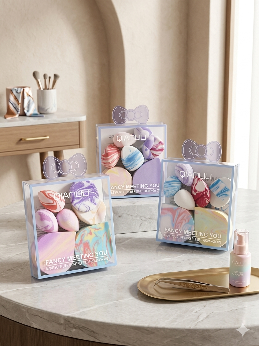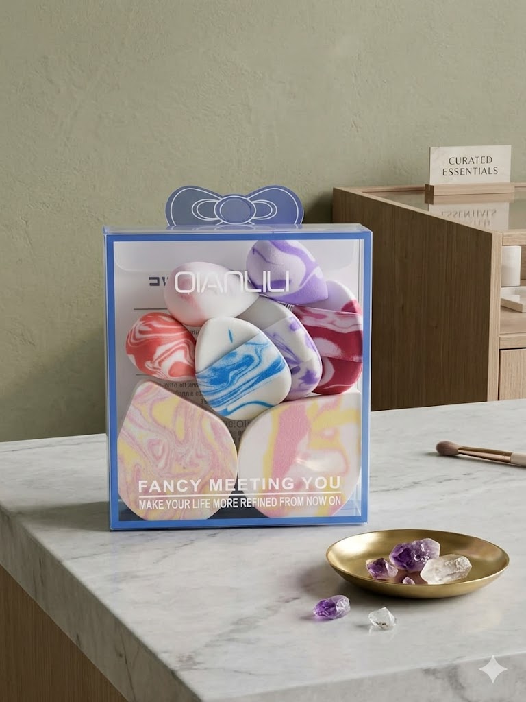 Elevate your beauty routine with this premium set of marble design makeup sponges, beautifully packed in a stylish transparent box. Each sponge features a unique swirl pattern in soft pastel shades, combining elegance with performance.